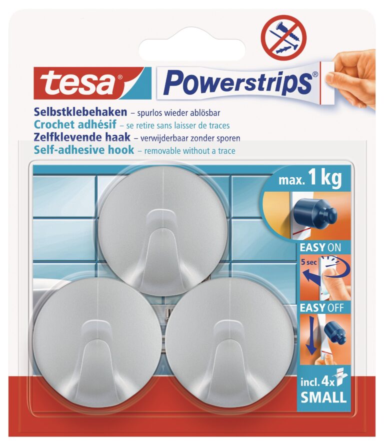 TESA Powerstrips Hooks Small Round 3 Hooks/4 Strips Chrome Matt
