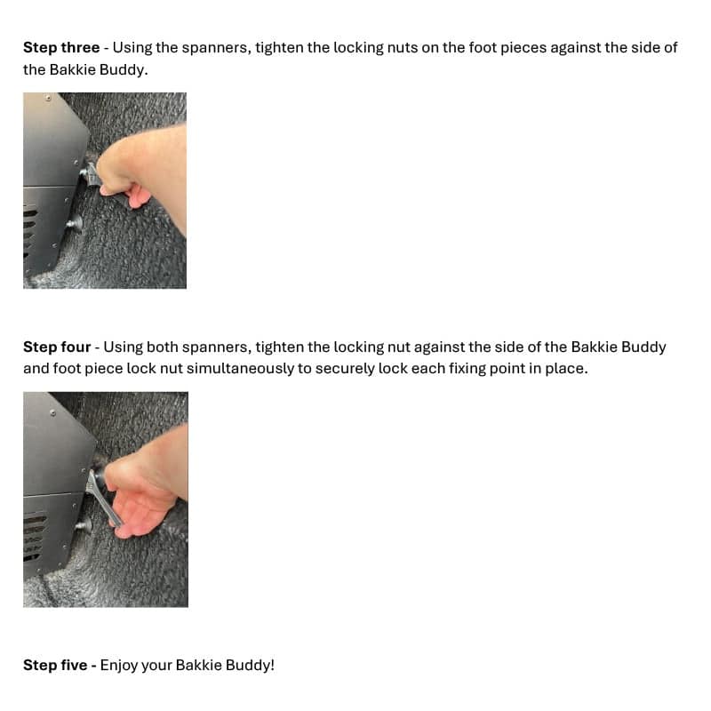 Bakkie Buddy Light includes two adjustable locking foot pieces at either end and is supplied with two multi spanners for installation.