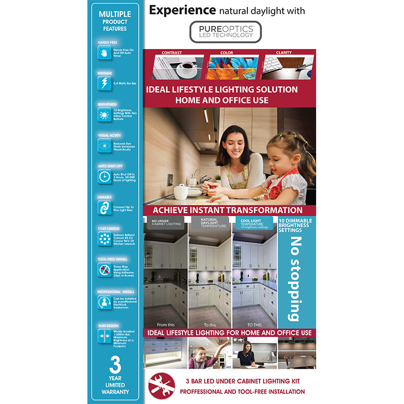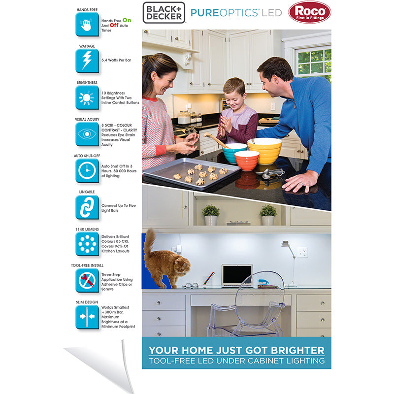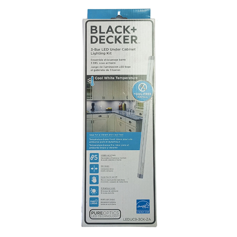 BLACK+DECKER 3 Bar LED Under Cabinet Lighting Kit is used to upgrade the aesthetics of any space under warm, rich lighting that creates a calm and inviting ambiance. Ideal for use as accent lighting around the home or office in kitchens, pantries, closets, vanities, bookshelves, display cases and more.