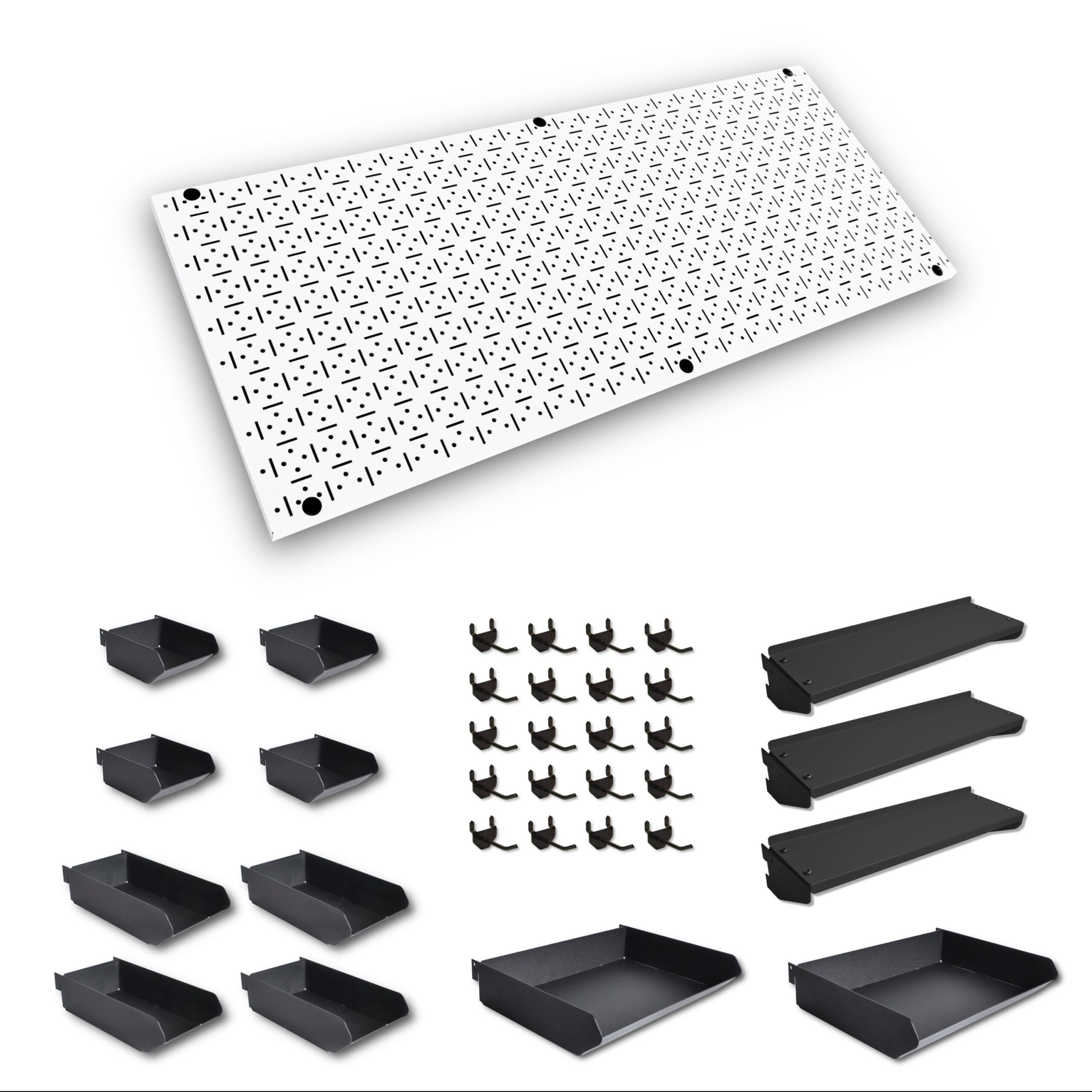 This mixed accessory pack offers a balanced combination of hooks, shelves, and storage bins, giving you flexible storage for hand tools, hardware, small components, and frequently used items.