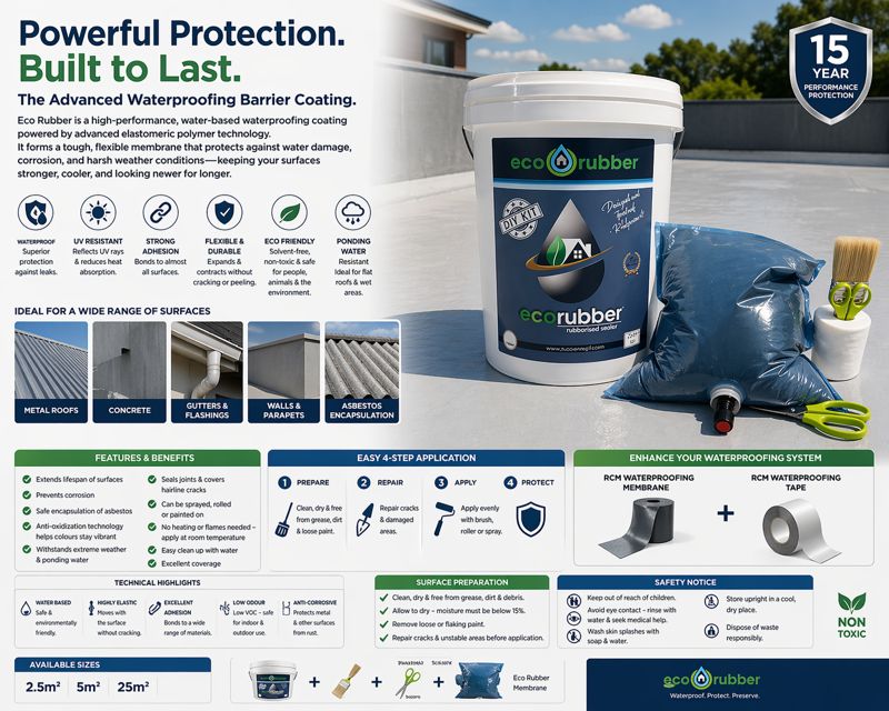 Eco Rubber forms a durable, flexible membrane that protects against water damage, corrosion, and harsh weather conditions. Its superior adhesion has been tested and proven to resist weathering, cracking, and chalking, while its anti-oxidization technology keeps colours vibrant and reduces fading over time. Perfect for metal surfaces and a wide range of construction materials, Eco Rubber delivers long-lasting protection you can trust.