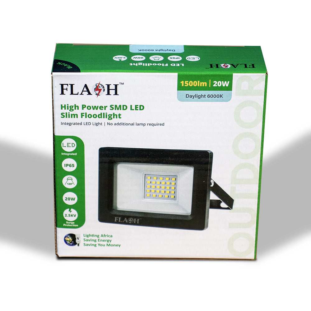 The Flash 20W LED Slim Floodlight is a compact yet powerful lighting solution designed for outdoor applications where bright, reliable illumination is essential. Utilizing advanced LED technology, this floodlight delivers an impressive 1,500 lumens, making it ideal for entryways, patios, and doorways/ gateways lightings.