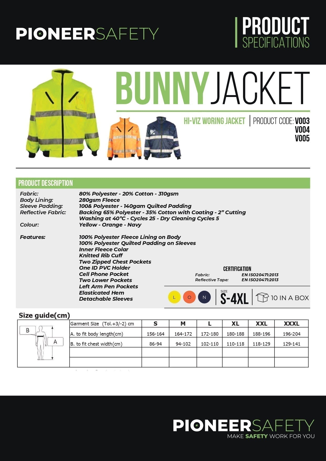 Compliance: Our Bunny Jackets adhere to the Standard EN ISO20471:2013, ensuring that you have reliable and certified high visibility workwear.