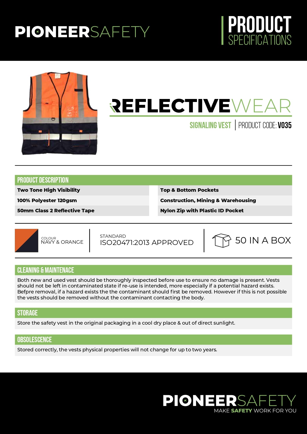 1 x PIONEER SAFETY Vests Pioneer Signaling With Zip Id Pocket Orange/Navy