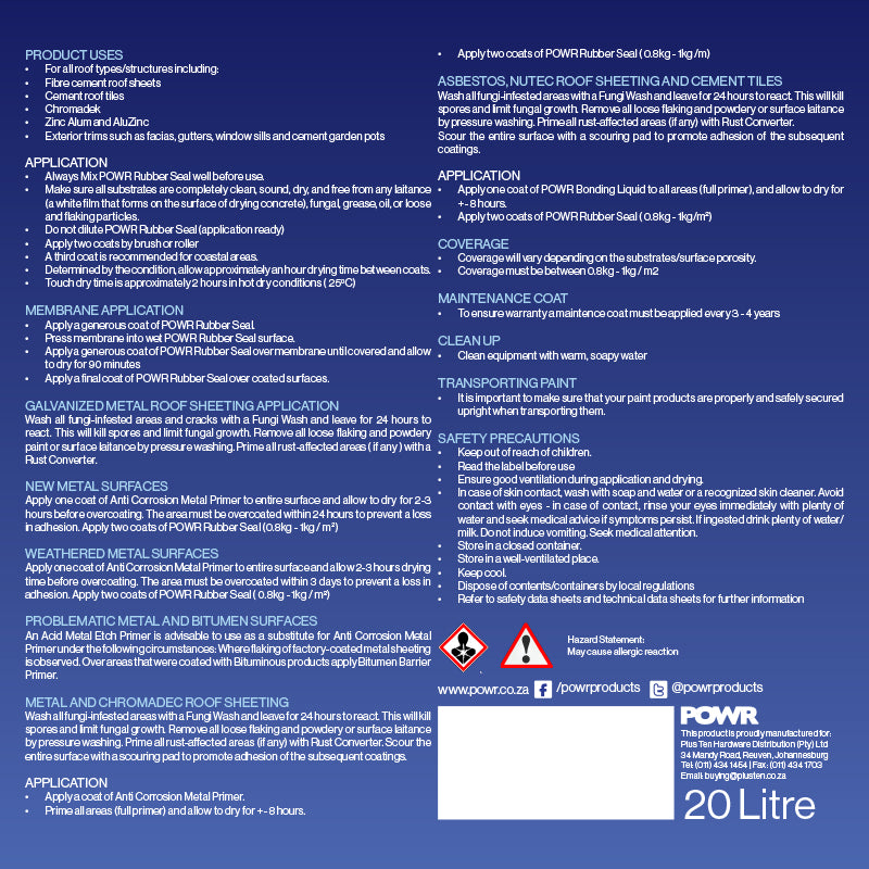 - Apply two coats of POWR Rubber Seal ( 0.8kg – 1kg /m)