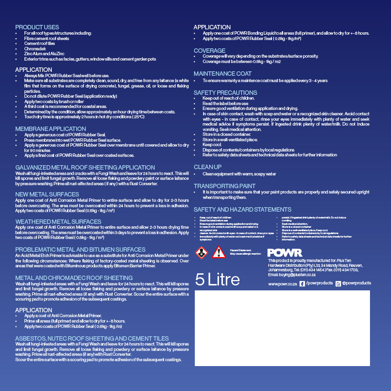 - Do not dilute POWR Rubber Seal (application ready)