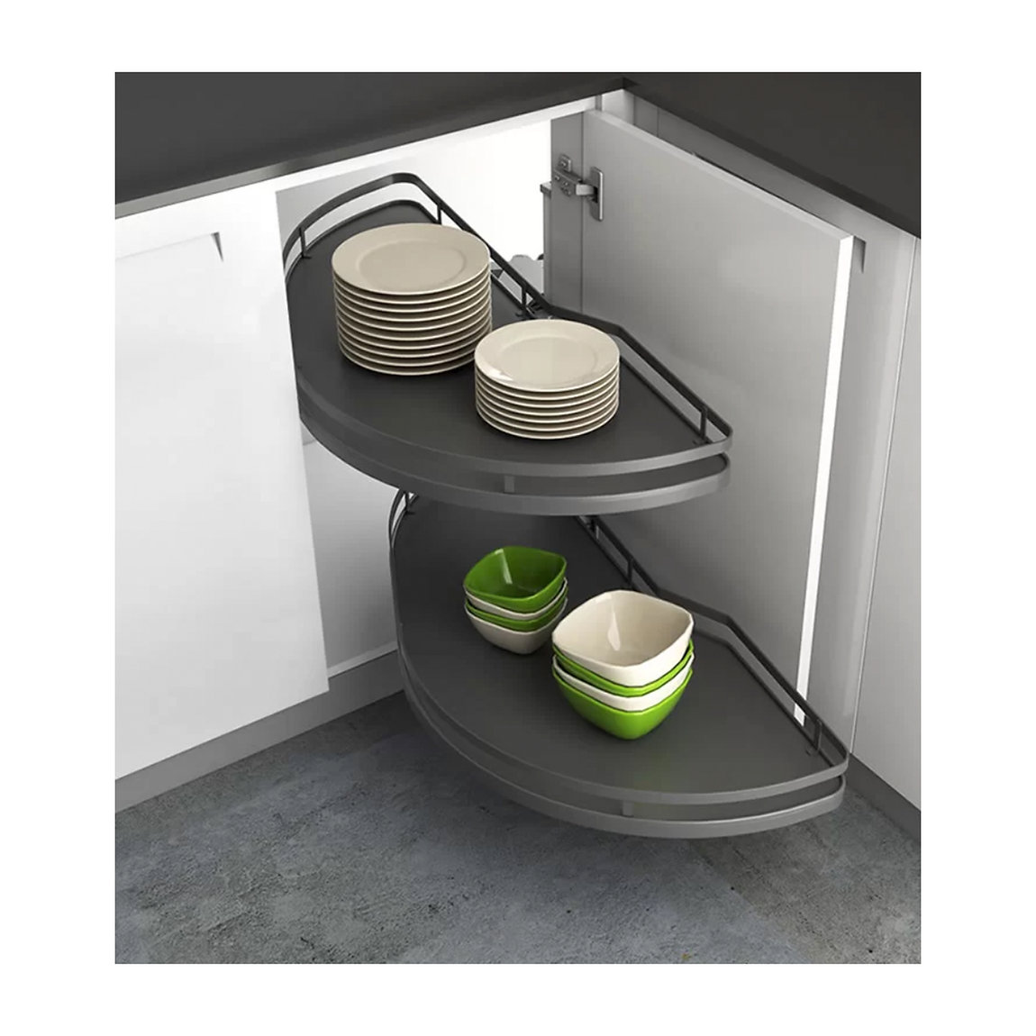 - Designed for corner cabinet storage optimization