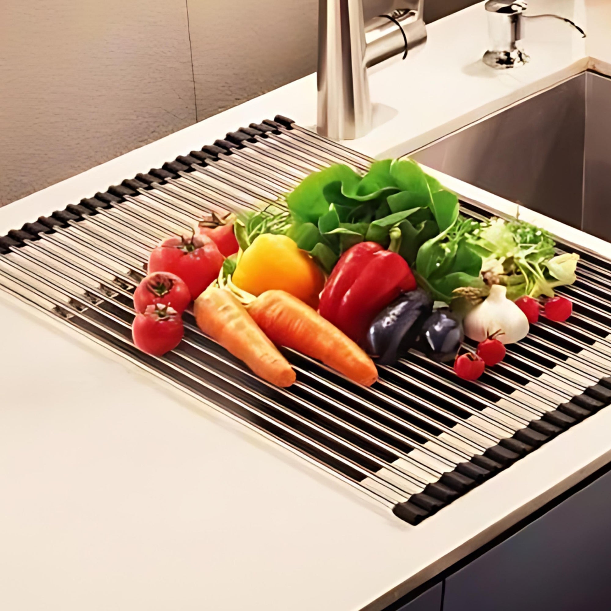Not just a drying rack for dishes but also a cooling rack for bread, a vegetable colander for veggie wash, a heat-resistant trivet mat for hot pots, and a kitchen sink bottom protector.