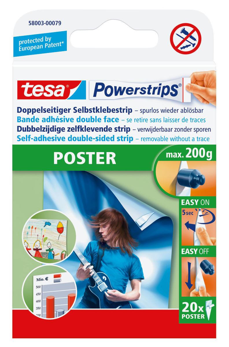 TESA Powerstrips Poster 20 Strips Poster Self-Adhesive Double-Sided Strips – securely holds up to 200g and removable without a trace