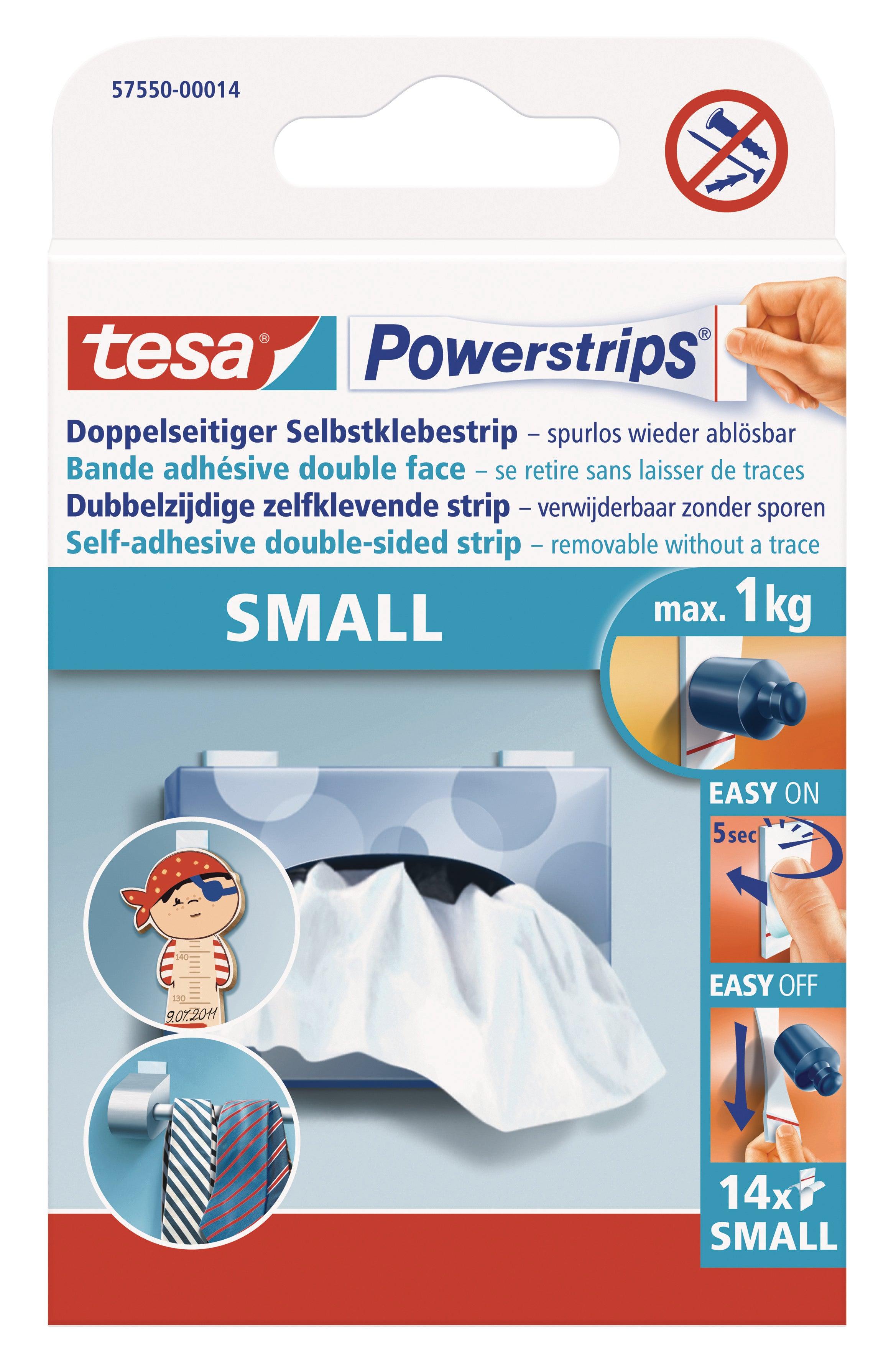 TESA Powerstrips Small 14 Strips Small Double-Sided Self-Adhesive Strips – removable, strong hold (up to 1kg), ideal for the fixation of small and flat objects