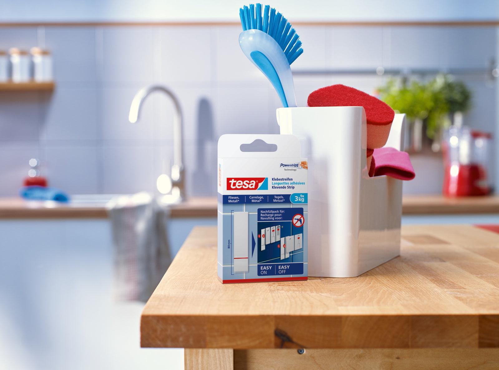 Tesa® Adhesive Strips for Tiles & Metal 3 kg mean you can use the Adhesive Nail for Tiles and Metal 3 kg as often as you like – so it’s great for the environment and for your bank balance. You can also use them on their own to mount objects directly onto your surfaces.
