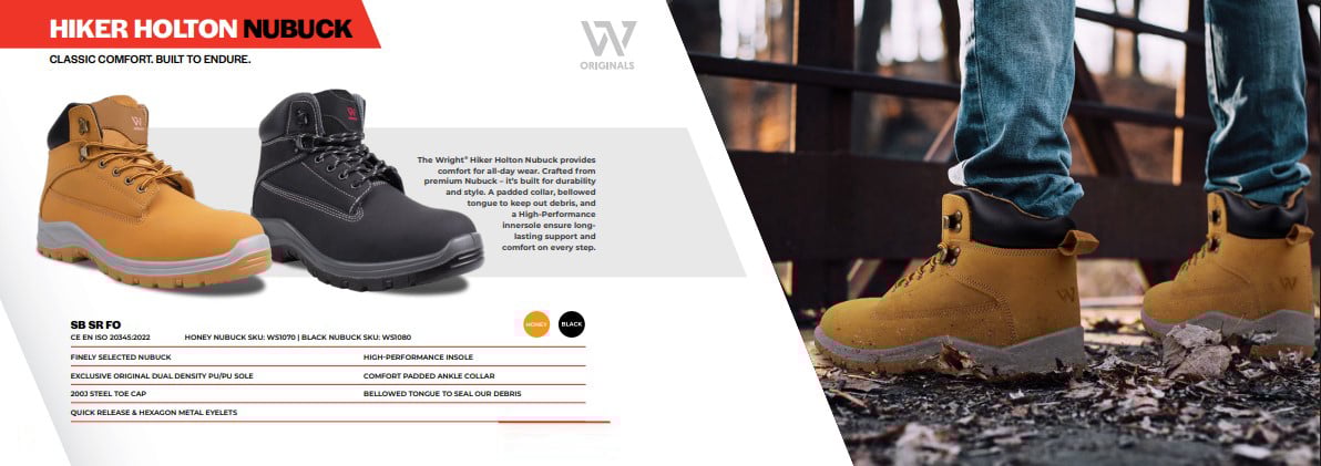 Features a 200J steel toe cap for maximum impact protection, while the padded collar and high-performance insole provide superior comfort and support throughout the day. The addition of a bellowed tongue helps keep out debris, ensuring a cleaner and safer working experience.  The Wright® Hiker Holton Nubuck is ideal for professionals seeking premium Nubuck style, rugged durability, and all-day comfort in a high-performance safety boot.
